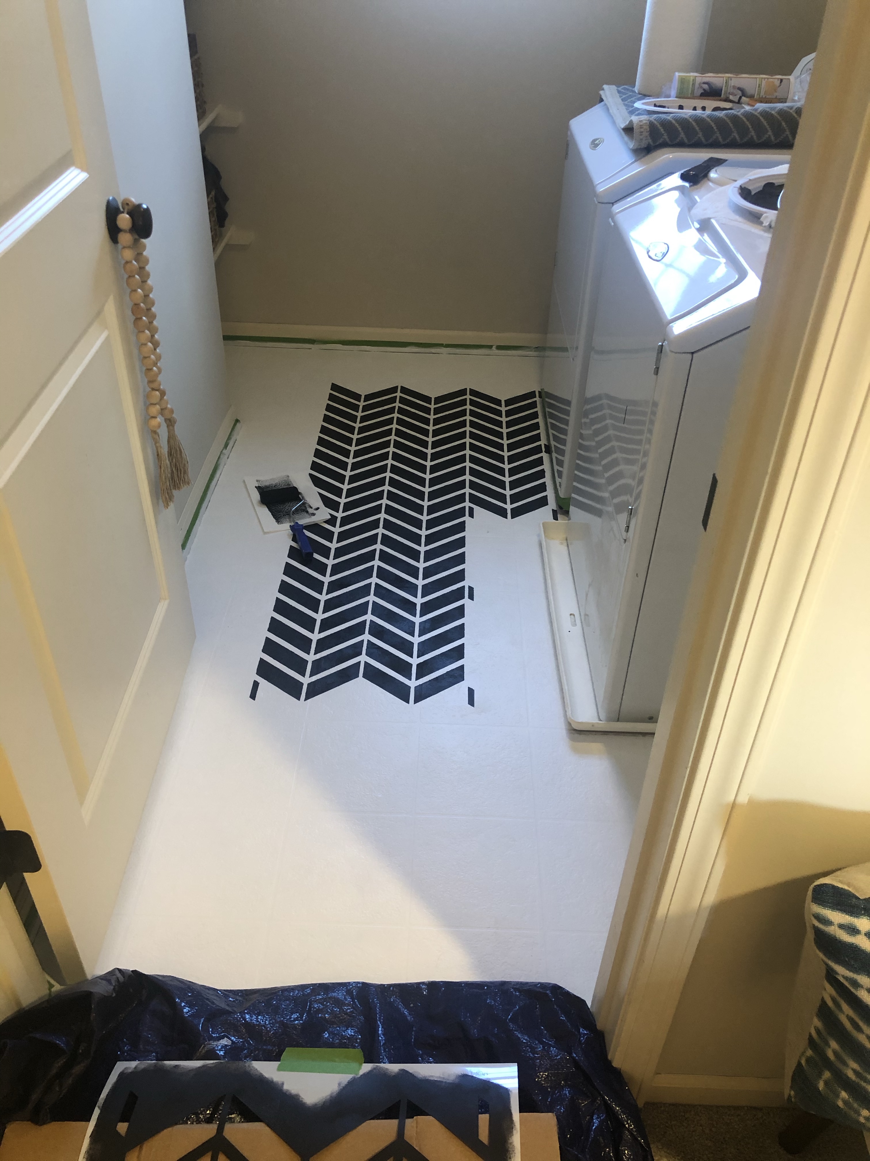 Before I started stenciling I sprayed the back of the stencil with a spray adhesive to prevent movement while painting. Make sure to use an adjustable spray adhesive to prevent the stencil from sticking to the floor. I found this at Michael’s. I then laid out the stencil in the center of the floor and used my foam roller to apply the paint. I used Porch and Patio Enamel in Caviar Black from Sherwin Williams. I again paid more for a high quality paint that I knew would hold up through the laundry room traffic.