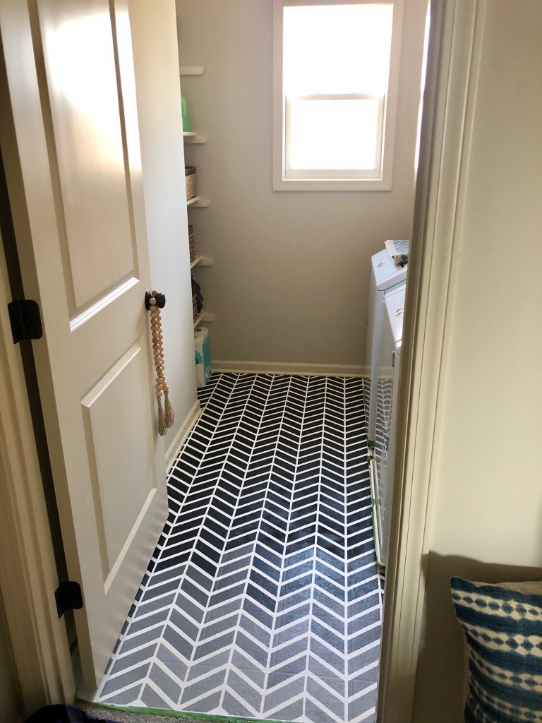As much as I wanted to immediately rip up the linoleum and lay tile in here it was not at the top of our priority list. There were way more important things like, no light fixtures in the house except “boob lights” in the bedrooms. For some reason the previous owners decided to take the fixtures with them I guess? Not cool. Anyway, I did a lot of research and came across the Cutting Edge Stencils Instagram page. You can paint a floor?!? Yes pleeeeease. So I ended up picking a chevron wall stencil and using it as the pattern for my floor. I will say it was a time consuming process, but definitely worth it for the results. I was able to change the look of the entire room with paint and a stencil. And the result looks very similar to tile!