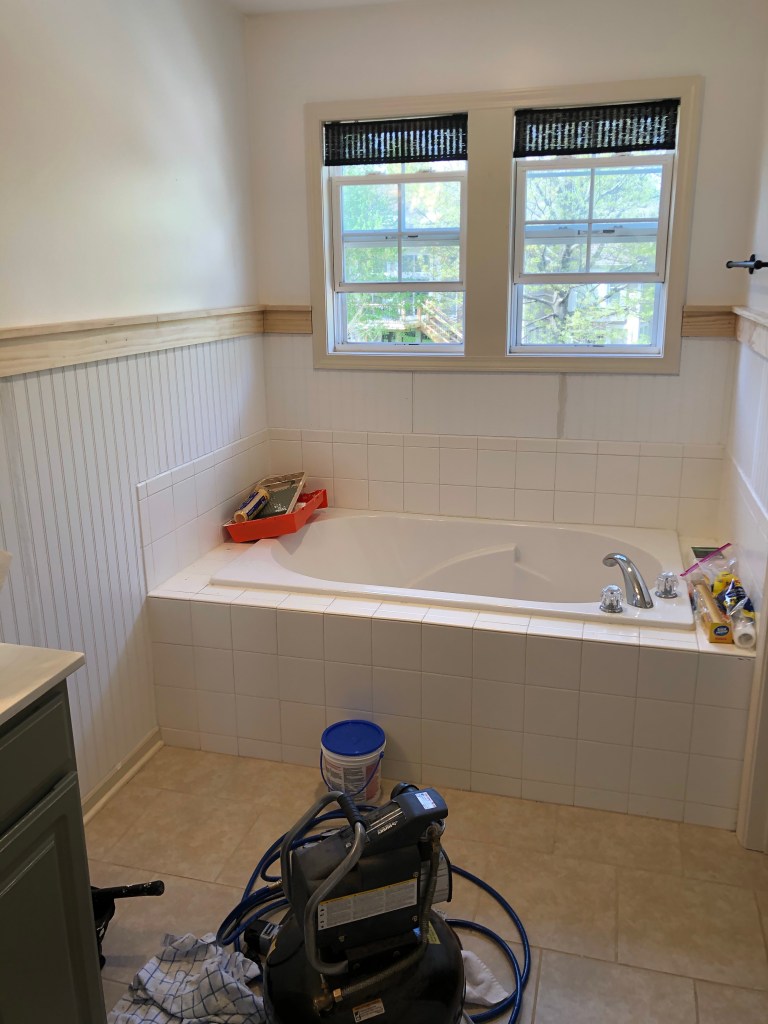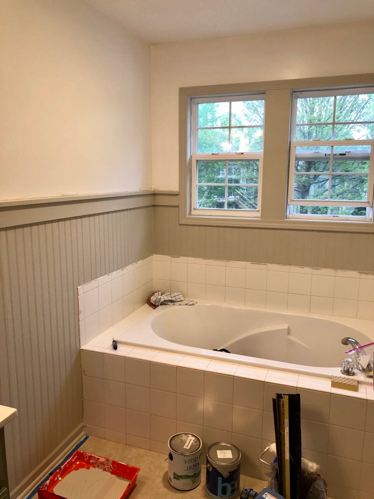 We took our early 2000’s vibe master bath and completely changed the look of it with some paint, beadboard, and new hardware. While I would’ve loved to completely renovate this space and change the layout to get rid of the tub and put in a giant shower, it just wasn’t in the budget being that we just bought our house. But it is now a place I enjoy spending time in and can live with for another 10 years until we have an extra 30K+ to renovate completely. And my dad says once you put some blood, sweat, and tears into a project, you may never want to destroy your hard work. He was a major part of this refresh. He measured and made the cuts on the beadboard and trim border. While I don’t think I could go and recreate this project myself, I could be much more efficient with many parts of this project next time.