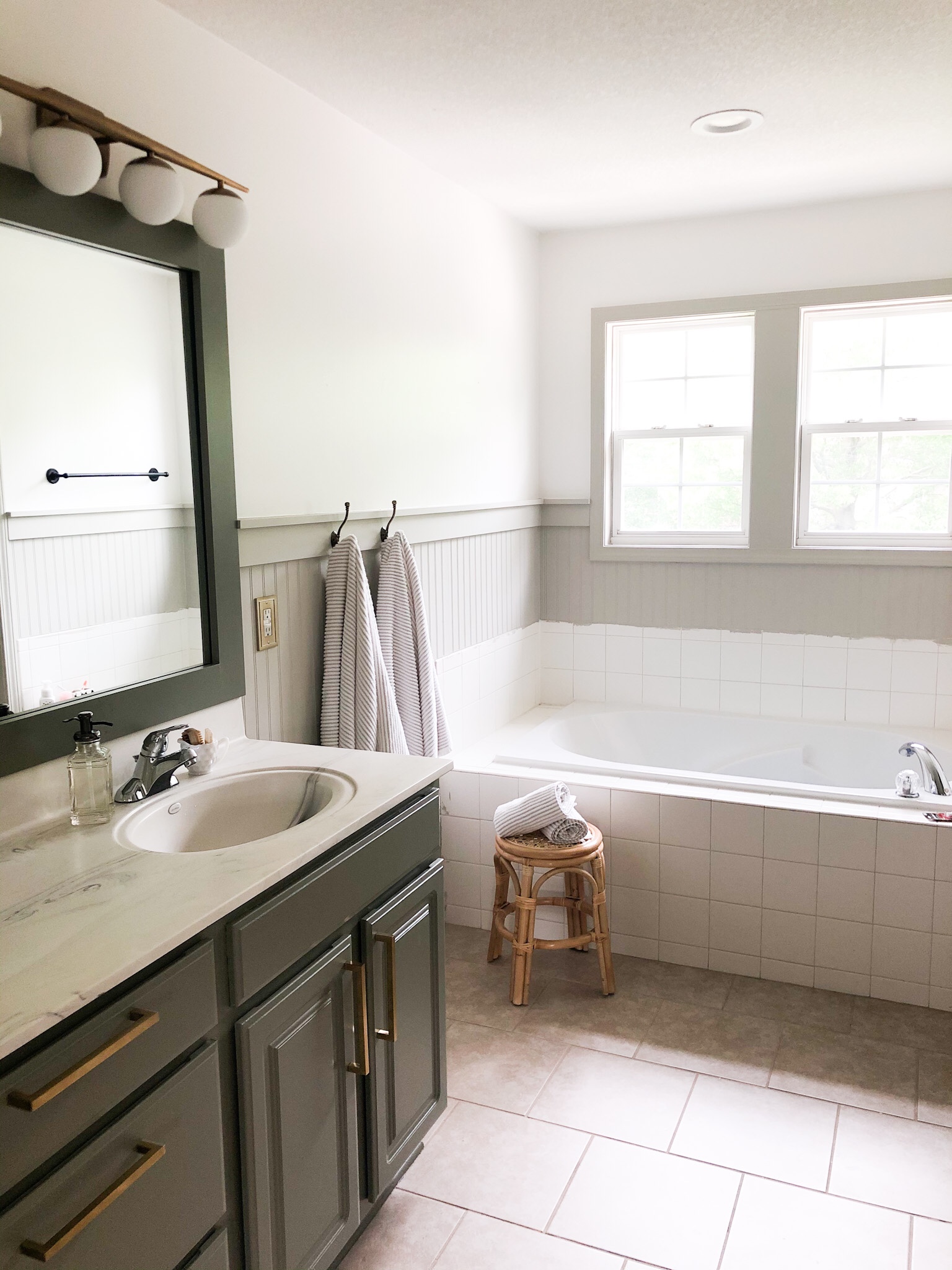 I used a large brush to brush the grooves then used a small foam roller to cover the beadboard. You’ll notice I didn’t use tape on the tiles because I have a fun project in store for those next. I painted the window, door trim, and doors the same color as the beadboard/border. After completing this we hung the DIY mirror frames, new light fixtures, and will soon be getting matching brass faucets to complete the project. YAY! New master bath here I come for some relaxation time!!!!