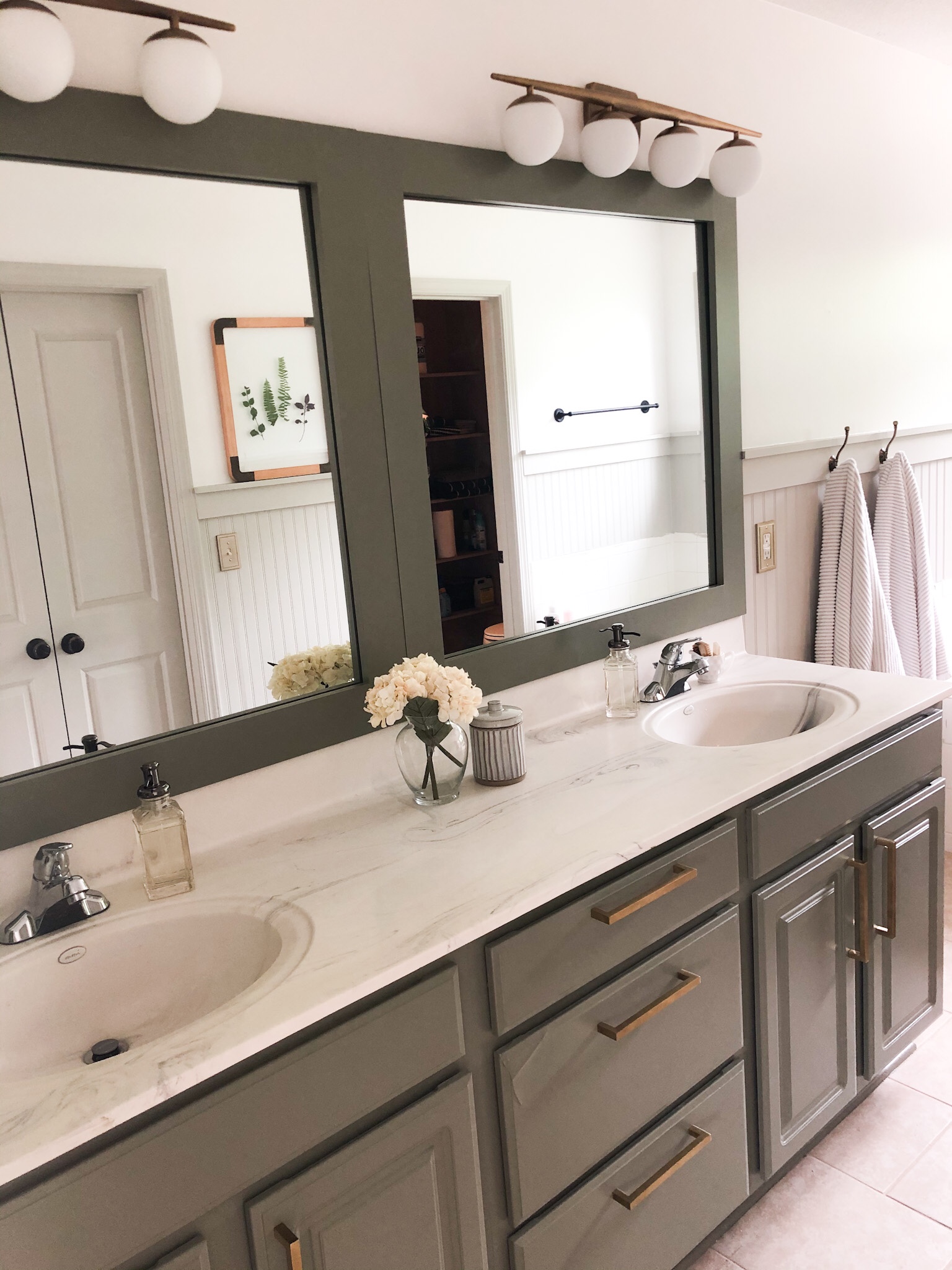 Now for the fun part, choosing paint colors. I have had a slight obsession with green lately, so I was determined to use some shade of green in the bathroom. I can also thank The White Buffalo Styling Co for finding the most gorgeous color of green. It’s Conduit Gray by Sherwin Williams. Even though it’s called gray it looks like a deep sage green. I needed to find a color that complimented this so I chose a “greige” color. My eye kept coming back to the same color I first saw in @amberinteriors kitchen, Revere Pewter by Benjamin Moore. If there was a way I could love another color as much the green I used on the vanity, this was it.